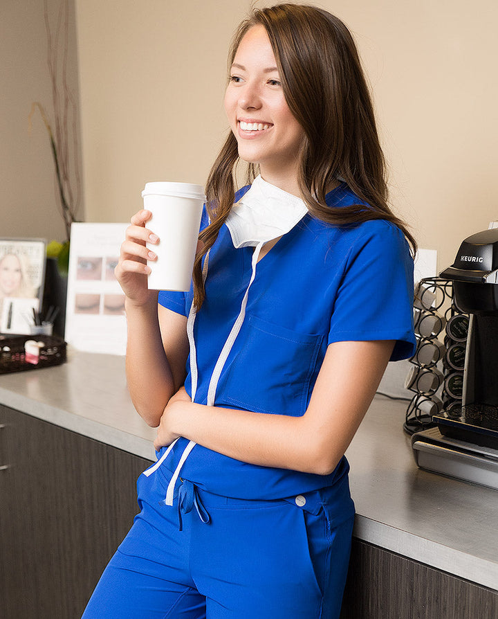 Again, our side slits at the hips of our scrubs help you move around more easily. Our stretch scrubs also feature plenty of pocket space for your gadgets, like your cell phone, stethoscope, keys, and even a secret pocket that’s great for stowing away jewelry while you’re on the clock!