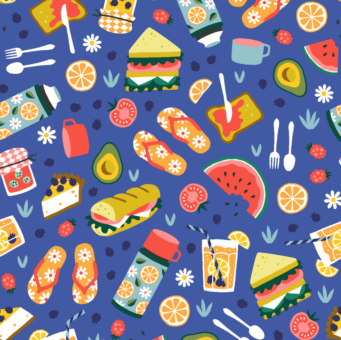 Think sandwiches, flip-flops, fruit, and lemonade—all the sweet little joys of a summer picnic wrapped up in one happy design.