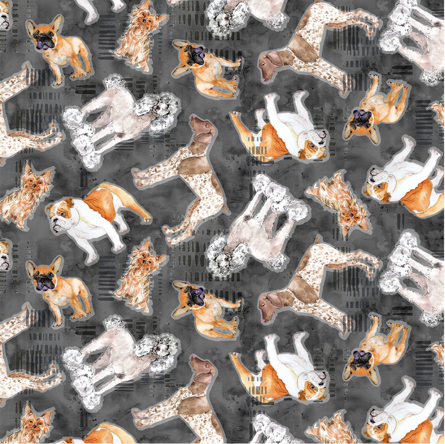 Adorable pups of every shape and size frolic against a moody gray backdrop, adding a splash of whimsy to the scene
