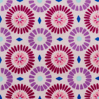 This mask is decorated with plum and raspberry spirals with royal blue diamond pops on an eggshell canvas. It is finished with soft and adjustable color-coordinating elastic ear straps.