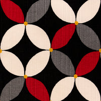 Lovely ecru, charcoal, and scarlet petals meet with a speck of gold on a stark black backdrop with a raised textured finish.