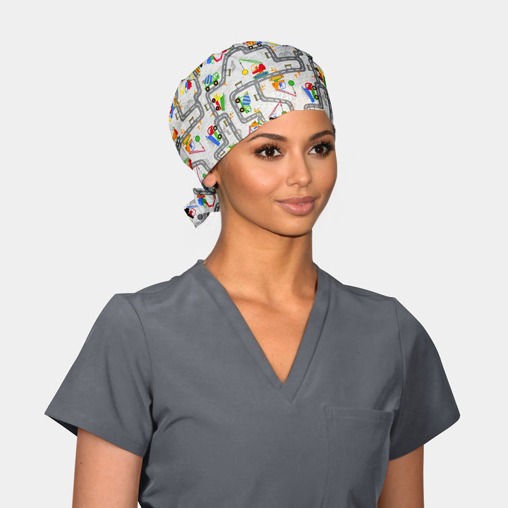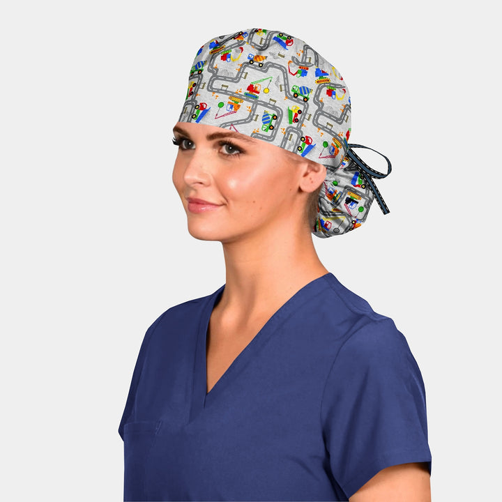 An adorable mask with a playful construction zone scene with grey and white roadways contrasted by bright and colorful toy trucks. Your little tykes will love this one!
