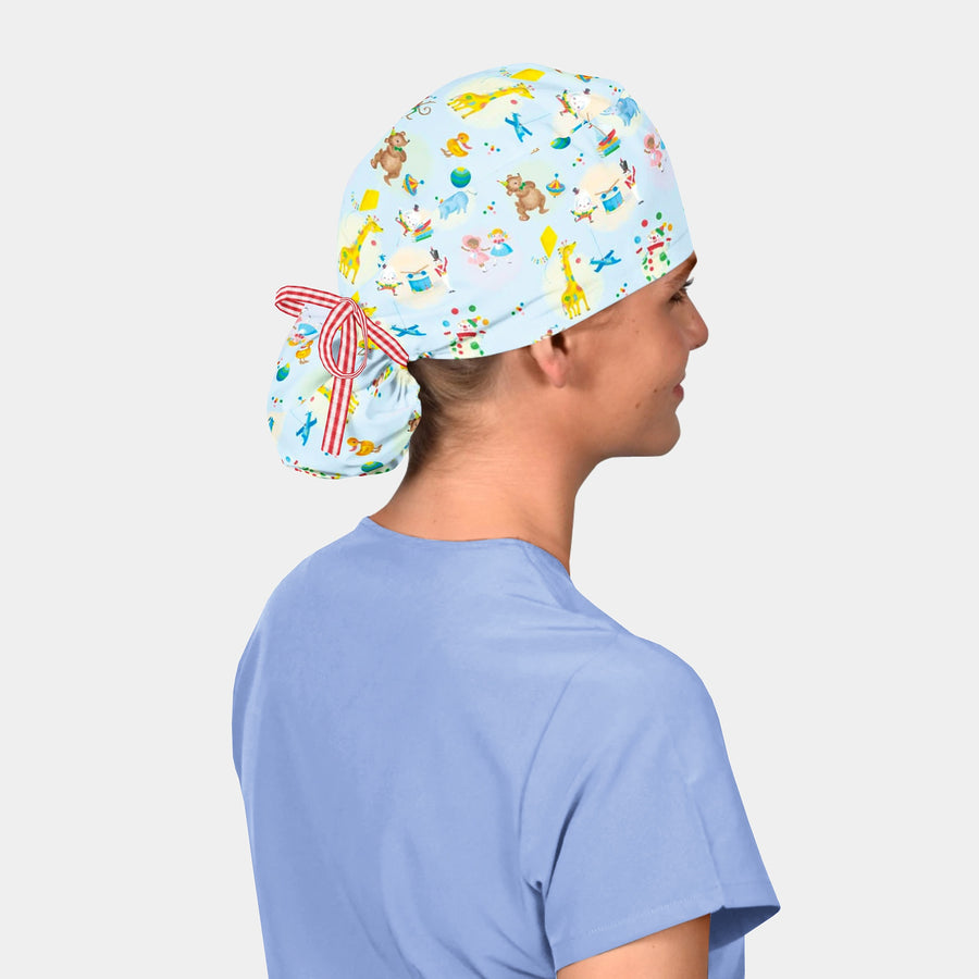 These baby blue surgeon caps will bring joy to your heart with the adorable circus characters and light fluffy clouds drifting through the sky.