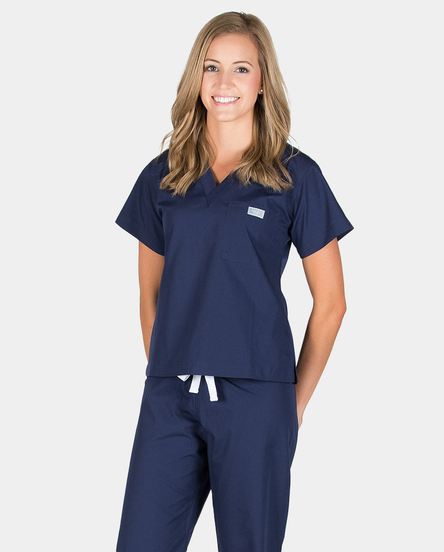 Super-tailored and simply styled, this basic scrub top is made from premium poly/cotton fabric blend that is medium weight, will not fade, and gets softer and softer over time. Perfectly layerable, durable and versatile....these scrubs definitely stand the test of time. They may feel slightly stiff when you first receive them, but trust us...they get softer and softer with every wash and you will wear them for years on end.