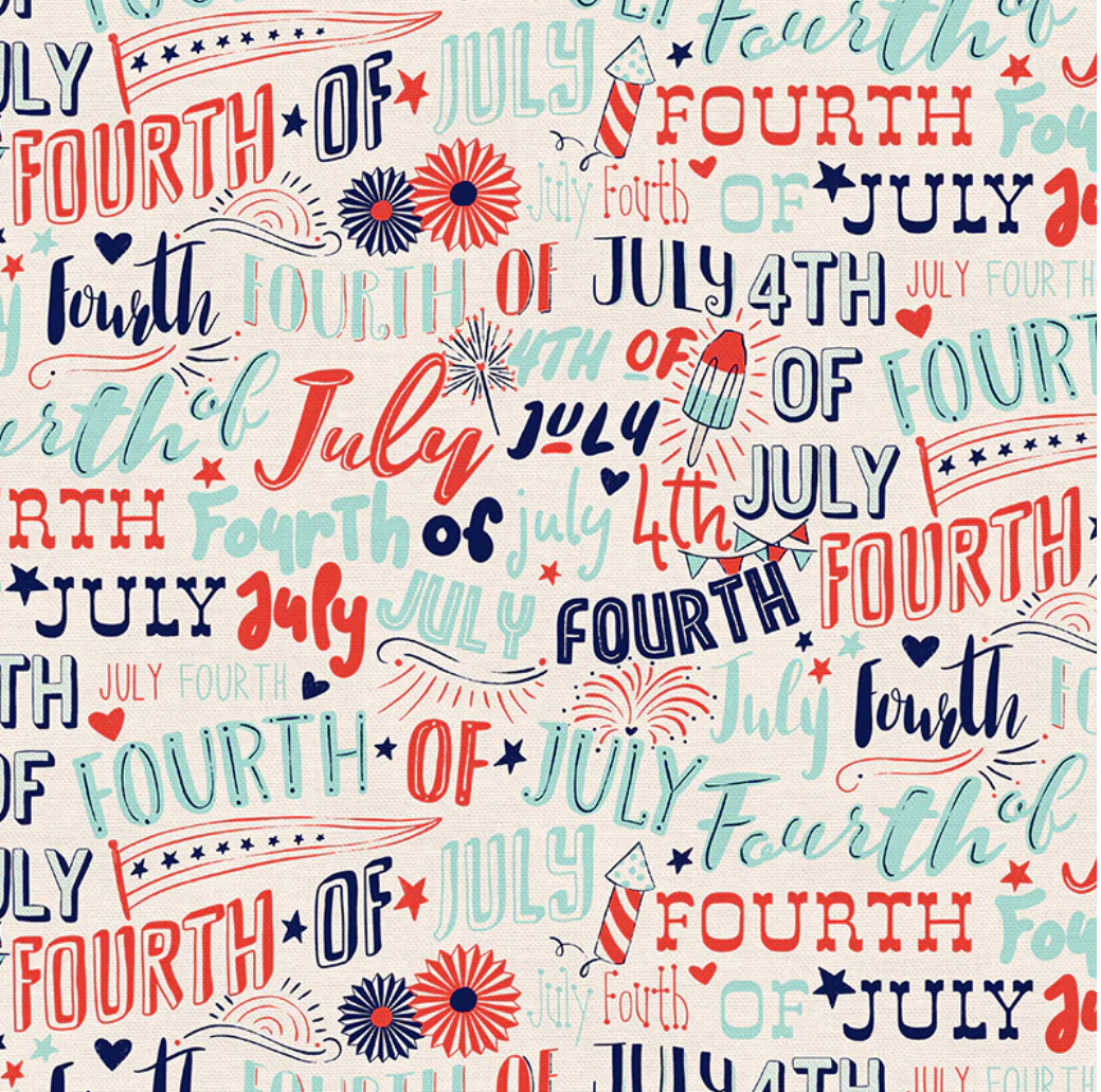 This festive pattern bursts with patriotic flair, featuring playful hand-lettered “Fourth of July” phrases, fireworks, and stars in classic red, white, and blue!