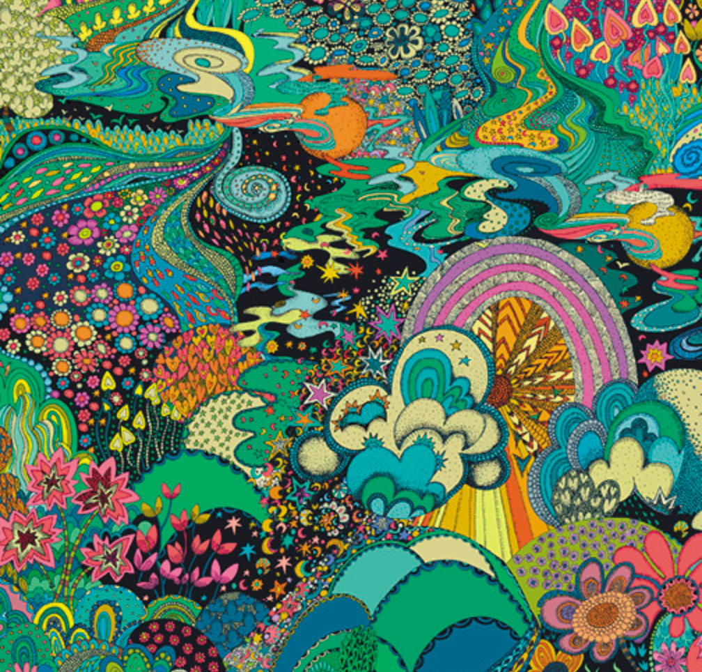 A wild, trippy swirl of cosmic rainbows, groovy clouds, and flower power magic straight out of a 70s daydream.