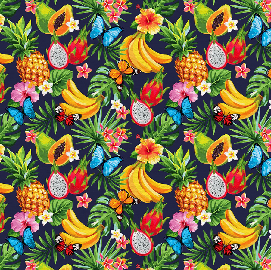 A tropical medley of lush fruits and vibrant florals bursts to life in this playful, island-inspired print that’s as fresh and fun as a summer getaway.