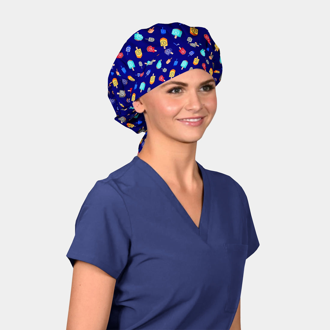 OR green scrubs and pewter grey scrubs match perfectly with these Hanukkah-inspired scrub caps for women bouffant.