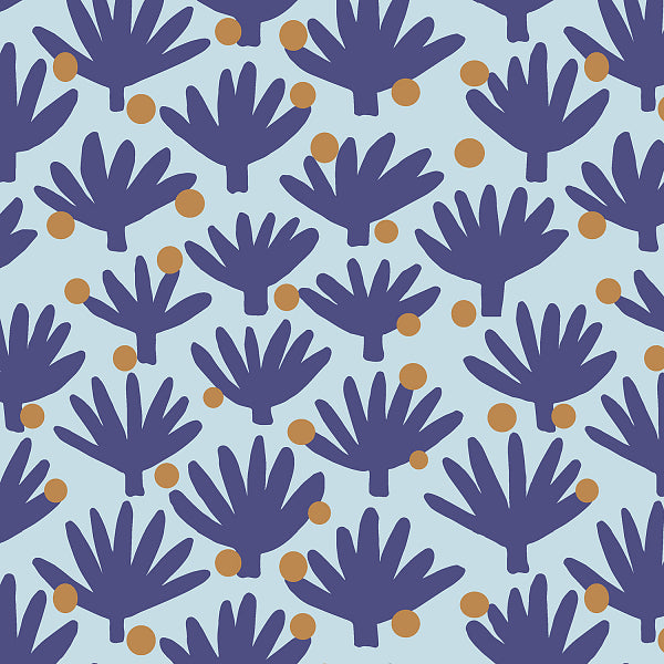 Feel the warm tropical breeze from these crystal clear aquamarine ocean waters and the sounds of midnight blue palms swishing through the air. Floating golden flecks add a rich tone to this simplistic and soothing pattern.