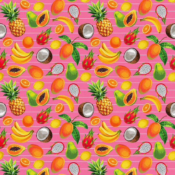 This pattern bursts with a rainbow of juicy tropical delights—pineapples, bananas, coconuts, dragon fruit, and more—scattered like candy on a vibrant pink picnic blanket!