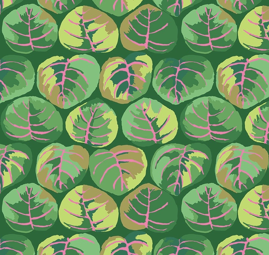 Rounded green leaves with vibrant pink veining dance across a deep forest background, creating a bold, tropical pattern full of movement and life.